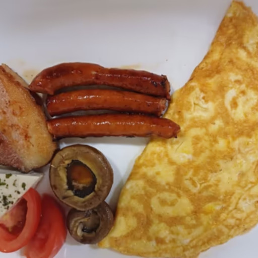 3 komada jaja, sir, paradajz. kobasica, slanina, hleb